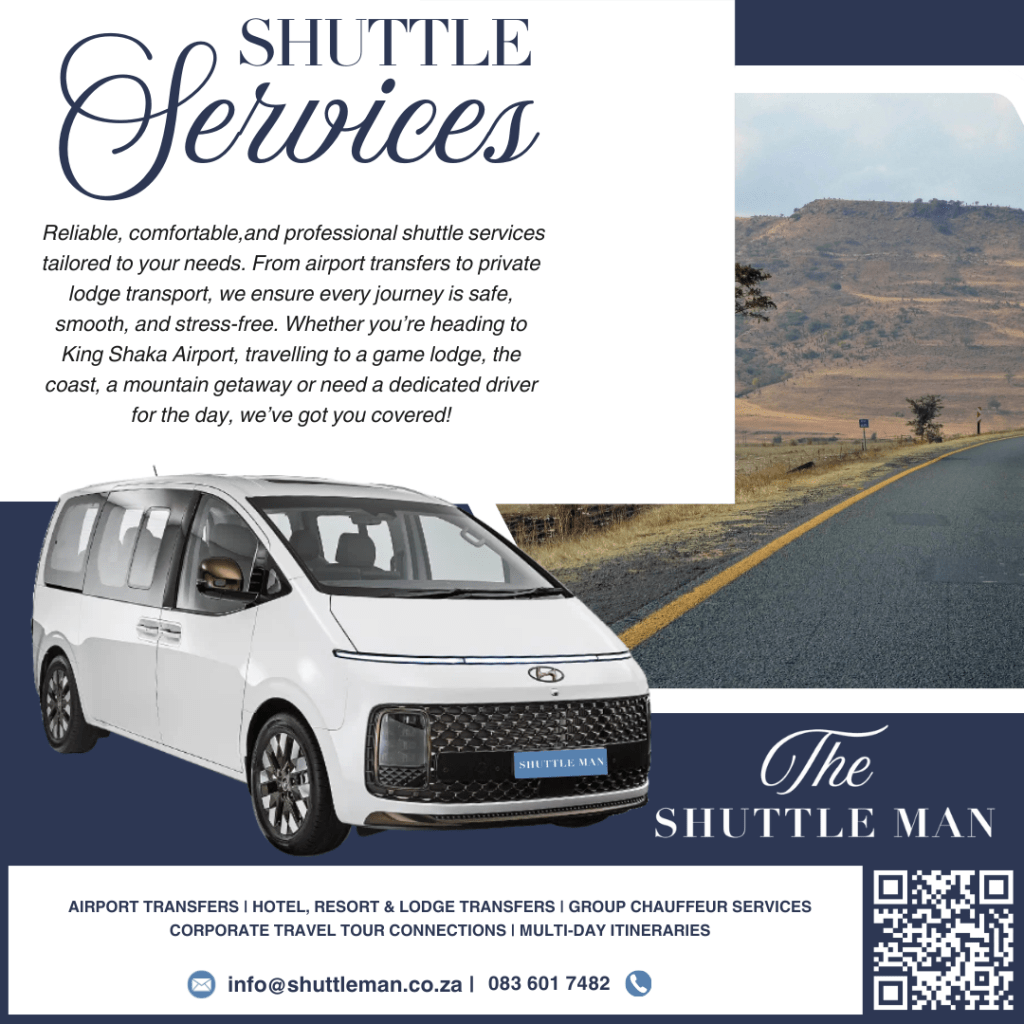 The Shuttle Man isn’t just another taxi service — they specialise in stress-free group and solo transfers, with air-conditioned vehicles, friendly drivers, and flexible pick-up/drop-off options across KwaZulu-Natal. Whether you’re heading to the airport, a corporate event, or a social gathering, The Shuttle Man has got you covered.